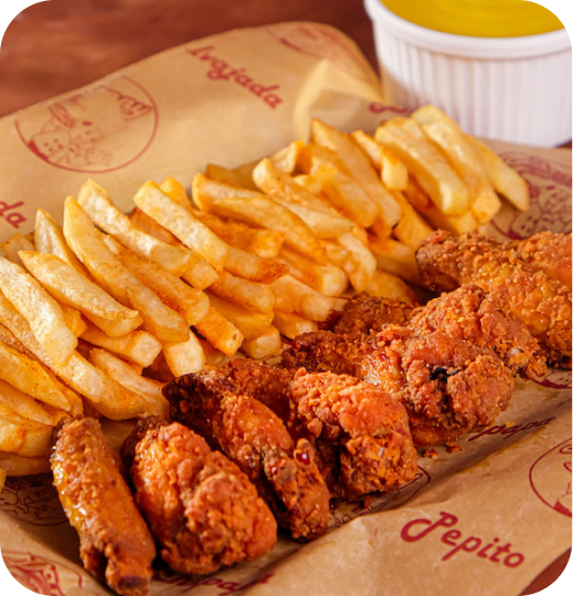 Contiene papas a la francesa, bañadas con tu salsa preferida, salsa bbq, miel mostaza, salsa picante
