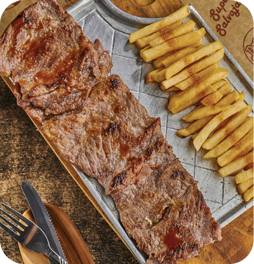 Contiene papas a la francesa, palitos de yuca o patacones, ensaladas y salsa de la casa.