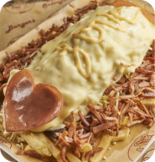 Contiene papas a la francesa, suiza, carne, tocineta, jamón, queso mozzarella.